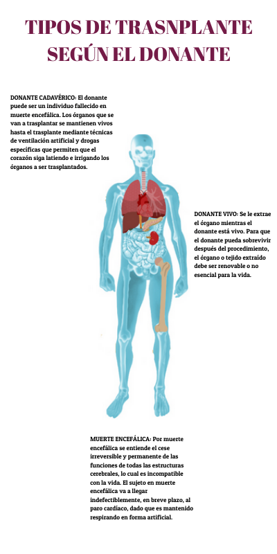 DONANTE CADAVÉRICO: El donante puede ser un individuo fallecido en muerte encefálica. Los órganos que se van a trasplantar se mantienen vivos hasta el trasplante mediante técnicas de ventilación artificial y drogas específicas que permiten que el corazón siga latiendo e irrigando los órganos a ser trasplantados.