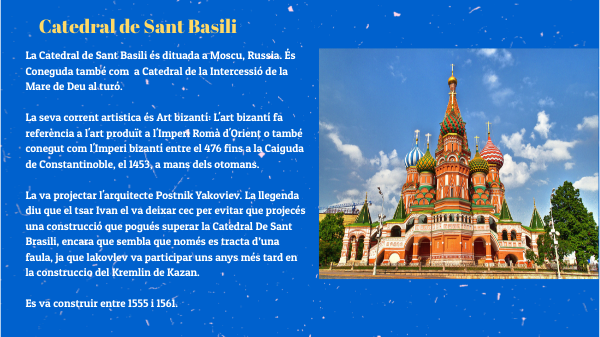 La Catedral de Sant Basili és dituada a Moscu, Russia. És Coneguda també com a Catedral de la Intercessió de la Mare de Deu al turó. La seva corrent artistica és Art bizantí: L'art bizantí fa referència a l'art produït a l'Imperi Romà d'Orient o també conegut com l'Imperi bizantí entre el 476 fins a la Caiguda de Constantinoble, el 1453, a mans dels otomans. La va projectar l'arquitecte Postnik Yakoviev. La llegenda diu que el tsar Ivan el va deixar cec per evitar que projecés una construcció que pogués superar la Catedral De Sant Brasili, encara que sembla que només es tracta d’una faula, ja que lakovlev va participar uns anys més tard en la construccio del Kremlin de Kazan. Es va construir entre 1555 i 1561.