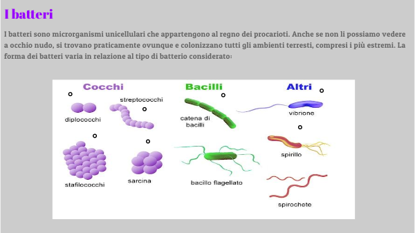 I batteri sono microrganismi unicellulari che appartengono al regno dei procarioti. Anche se non li possiamo vedere a occhio nudo, si trovano praticamente ovunque e colonizzano tutti gli ambienti terresti, compresi i più estremi. La forma dei batteri varia in relazione al tipo di batterio considerato: