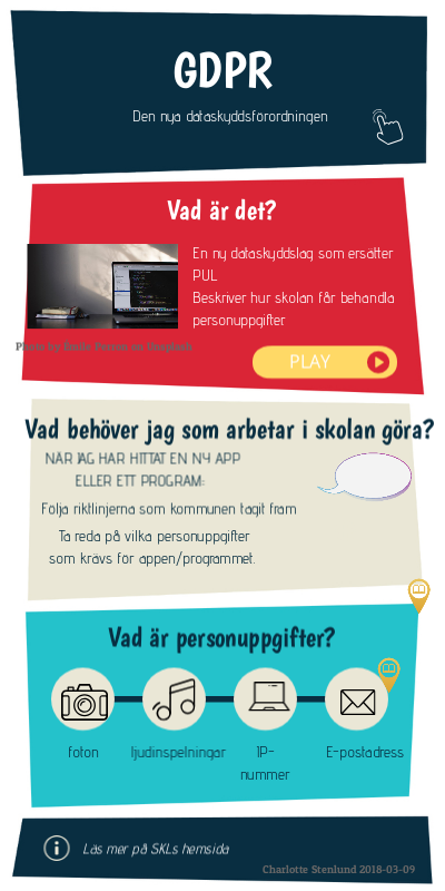 En ny dataskyddslag som ersätter PUL Beskriver hur skolan får behandla personuppgifter.
