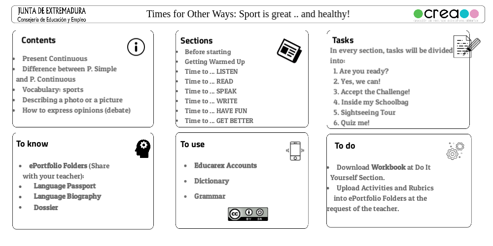 In every section, tasks will be divided into: 1. Are you ready? 2. Yes, we can! 3. Accept the Challenge! 4. Inside my Schoolbag 5. Sightseeing Tour 6. Quiz me!