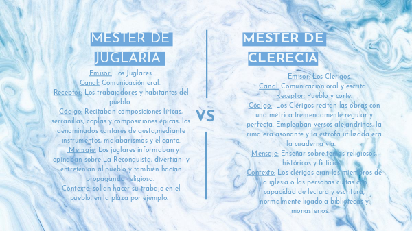 Emisor: Los Clérigos. Canal: Comunicacion oral y escrita. Receptor: Pueblo y corte. Código: Los Clérigos recitan las obras con una métrica tremendamente regular y perfecta. Empleaban versos alejandrinos, la rima era asonante y la estrofa utilizada era la cuaderna vía. Mensaje: Enseñar sobre temas religiosos, históricos y ficticios. Contexto: Los clérigos eran los miembros de la iglesia o las personas cultas con capacidad de lectura y escritura, normalmente ligado a bibliotecas y monasterios.