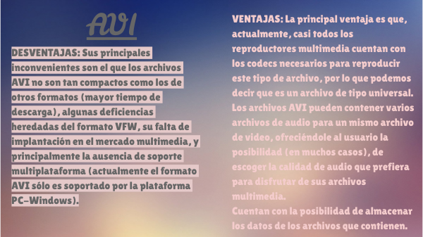 DESVENTAJAS: Sus principales inconvenientes son el que los archivos AVI no son tan compactos como los de otros formatos (mayor tiempo de descarga), algunas deficiencias heredadas del formato VFW, su falta de implantación en el mercado multimedia, y principalmente la ausencia de soporte multiplataforma (actualmente el formato AVI sólo es soportado por la plataforma PC-Windows).