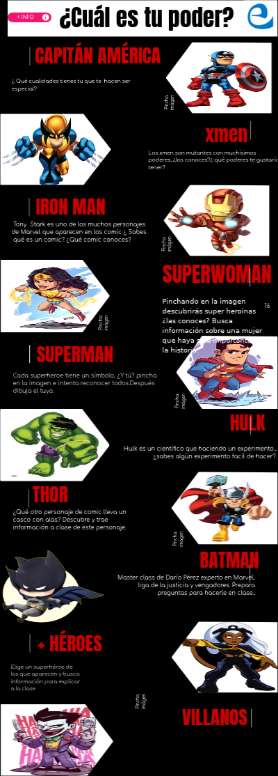 Elige un superhéroe de los que aparecen y busca información para explicar a la clase