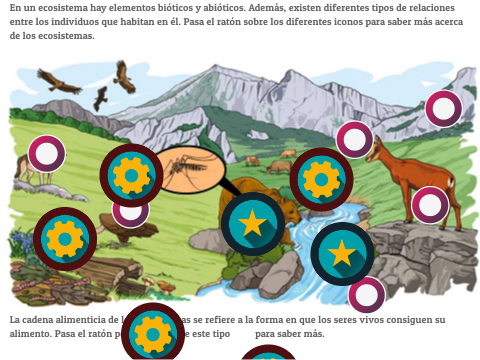 En un ecosistema hay elementos bióticos y abióticos. Además, existen diferentes tipos de relaciones entre los individuos que habitan en él. Pasa el ratón sobre los diferentes iconos para saber más acerca de los ecosistemas.