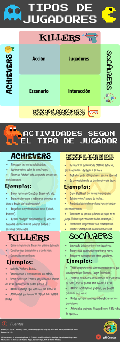 Bartle, R. (1996) Hearts, Clubs, Diamonds,Spades:Players Who Suit MUDs.Journal of MUD Research 1, 1.Zichermann, G. y Cunningham, C. (2011). Gamification by Design: Implementing Game Mechanics in Web and Mobile Apps. Cambridge, MA: O’Reilly Media.