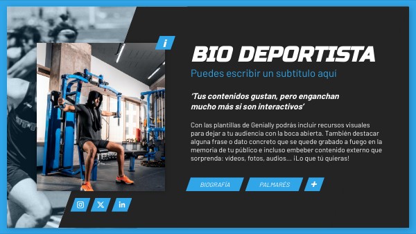 Con las plantillas de Genially podrás incluir recursos visualespara dejar a tu audiencia con la boca abierta. También destacar alguna frase o dato concreto que se quede grabado a fuego en la memoria de tu público e incluso embeber contenido externo que sorprenda: vídeos, fotos, audios... ¡Lo que tú quieras!
