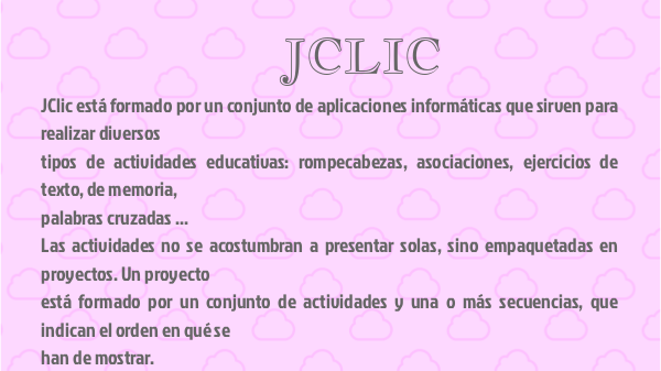El proyecto JClic es una evolución del programa Clic 3.0, una herramienta para la creación de aplicaciones didácticas multimedia con más de 10 años de historia. A lo largo de este tiempo han sido muchos los educadores y educadoras que lo han utilizado para crear actividades interactivas donde se trabajan aspectos procedimentales como diversas áreas del currículum, desde educación infantil hasta secundaria, principalmente.