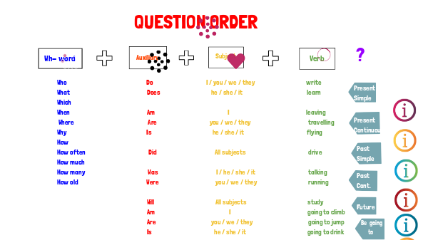 Who Do I / you / we / they write What Does he / she / it learn Which When Am I leaving Where Are you / we / they travelling Why Is he / she / it flying How How often Did All subjects drive How much How many Was I / he / she / it talking How old Were you / we / they running Will All subjects study Am I going to climb Are you / we / they going to jump Is he / she / it going to drink