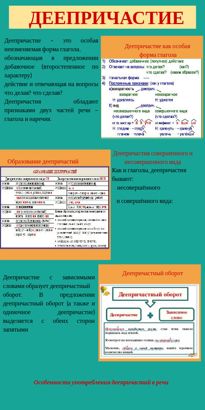 Деепричастие – это особая неизменяемая форма глагола, обозначающая в предложении добавочное (второстепенное по характеру) действие и отвечающая на вопросы что делая? что сделав? Деепричастия обладают признаками двух частей речи – глагола и наречия.