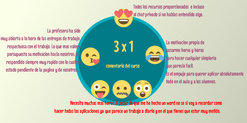 La profesora ha sido muy abierta a la hora de las entregas de trabajo, respectuosa con el trabajo. Lo que mas valoro porsupuesto su motivacion hacia nosotros. Ha respondido siempre muy rapido con lo cual ha estado pendiente de la pagina y de nosotros. .