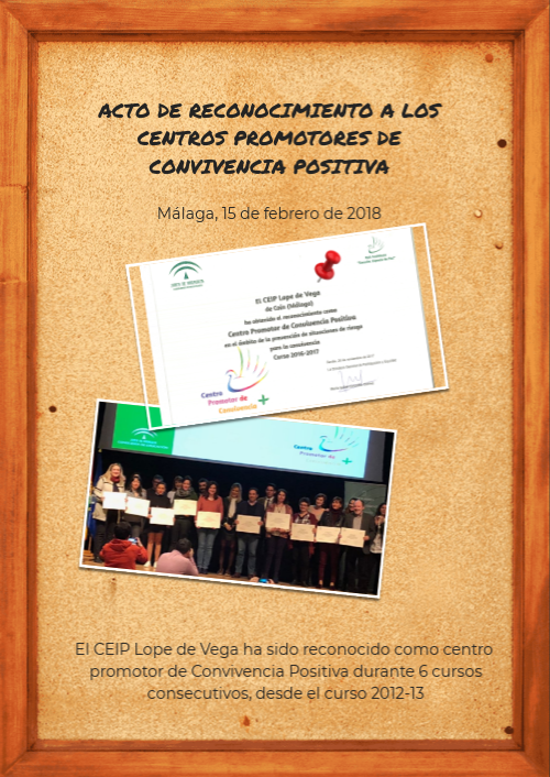 El CEIP Lope de Vega ha sido reconocido como centro promotor de Convivencia Positiva durante 6 cursos consecutivos, desde el curso 2012-13