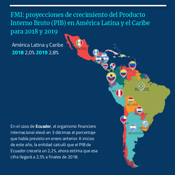 En el caso de Ecuador, el organismo financiero internacional elevó en 3 décimas el porcentaje que había previsto en enero anterior. A inicios de este año, la entidad calculó que el PIB de Ecuador crecería un 2,2%, ahora estima que esa cifra llegará a 2,5% a finales de 2018.