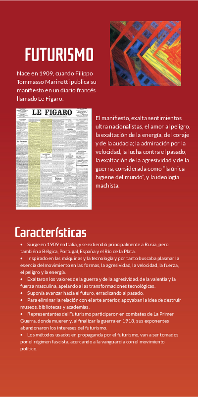 Nace en 1909, cuando Filippo Tommasso Marinetti publica su manifiesto en un diario francés llamado Le Figaro.