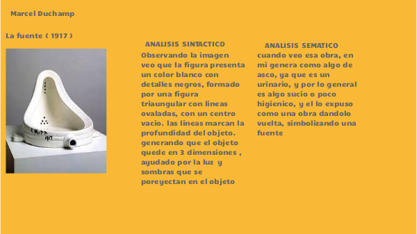 cuando veo esa obra, en mi genera como algo de asco, ya que es un urinario, y por lo general es algo sucio o poco higienico, y el lo expuso como una obra dandolo vuelta, simbolizando una fuente