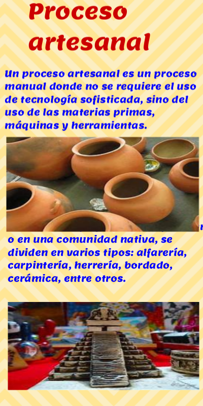 Un proceso artesanal es un proceso manual donde no se requiere el uso de tecnología sofisticada, sino del uso de las materias primas, máquinas y herramientas.