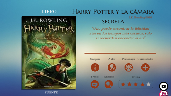 En mi opinión, yo pienso que este libro a pesar de ser el más corto de esta esta saga, también es en este en el que más acontecimientos pasan y donde nos introduce en los pensamientros de Harry. Por lo que este libro es genial para aquellos que les guste la mágia y quieran aprender más sobre la saga de Harry Poter.