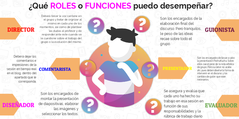 Son los encargados de llevar a cabo la presentación PechaKucha. Sobre ellos cae el peso de la nota artística de grupo. Pero su labor no acaba ahí, pues deben diseñar la forma de intervenir en el discurso y los cambios de guión que sean necesarios.