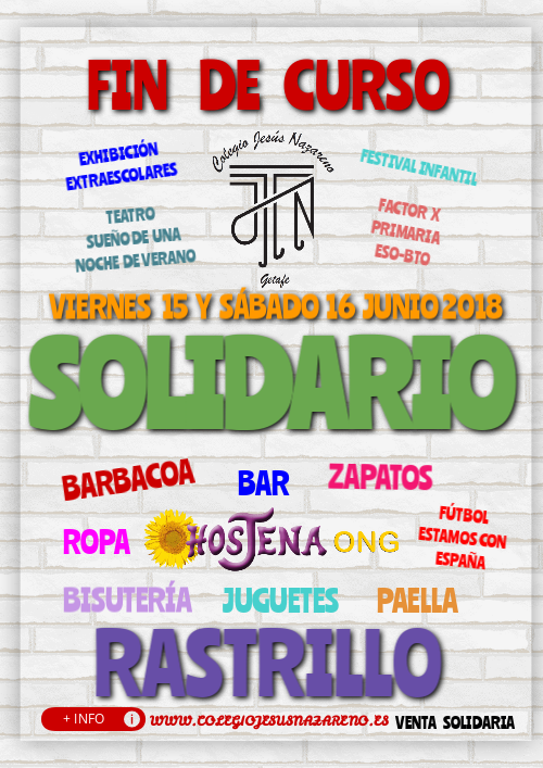 " Al lado de los que no cuentan" GRACIAS POR TODO EL TIEMPO GASTADO EN PREPARAR ESTE RASTRILLO Y FESTIVAL POR LOS ENSAYOS, DISFRACES, ENCARGOS, PEDIDOS, MONTAJE.... GRACIAS POR TODAS Y CADA UNA DE LAS MANOS QUE SE HAN PRESTADO A COLOCAR, COCINAR, ATENDER, VENDER, REGALAR, PATROCINAR, LIMPIAR, CUIDAR, SONREÍR, COORDINAR, ILUMINAR, REPARAR, ANIMAR, CONSUMIR, COMPRAR, DONAR.... POR CADA MIRADA, PALABRA, SONRISA, QUE HACEN POSIBLE QUE CADA EURO DE AQUÍ, LLEGUE CON HOSJENA ONG....ALLÁ... GRACIAS POR TODOS LOS QUE OS SUMARÉIS A NUESTROS RETOS HOSJENEROS POR TODOS LOS QUE OS SENTÍS, HERMANOS, AMIGOS, COMPAÑEROS, VOLUNTARIOS...Y QUE HARÉIS DE VUESTRO TIEMPO, DE VUESTROS BIENES A HOSJENA...UN REGALO. GRACIAS POR SER Y POR HACER QUE NUESTRO COLE VIVA CADA FIN DE CURSO COMO UNA GRAN FIESTA DE LA SOLIDARIDAD. Y POR CREAR FAMILIA HOSPITALARIA Y HOSJENERA ... UN AÑO MÁS.
