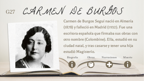 Carmen de Burgos Seguí nació en Almería (1878) y falleció en Madrid (1932). Fue una escritora española que firmaba sus obras con otro nombre (Colombine). Ella, estudió en su ciudad natal, y tras casarse y tener una hija estudió Magisterio.