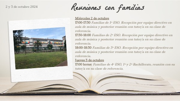 Miércoles 2 de octubre17:00-17:30 Familias de 1º ESO. Recepción por equipo directivo en aula de música y posterior reunión con tutor/a en su clase de referencia.17:30-18:00 Familias de 2º ESO. Recepción por equipo directivo en aula de música y posterior reunión con tutor/a en su clase de referencia.18:00-18:30 Familias de 3º ESO. Recepción por equipo directivo en aula de música y posterior reunión con tutor/a en su clase de referencia.Jueves 3 de octubre 17:00 horas: Familias de 4º ESO, 1º y 2º Bachillerato, reunión con su tutor/a en su clase de referencia.