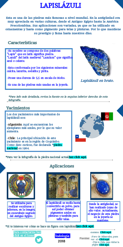 -Su nombre se compone de dos palabras: "Lapis" que en latín significa piedra. "Lazuli" del latín medieval "Lazulum" que significa azul o celeste. -Esta conformada por los siguientes minerales: calcita, lazurita, sodalita y pirita. -Posee una dureza de 5,5 en escala de Mohs. -Es una de las piedras más usadas en la joyería.