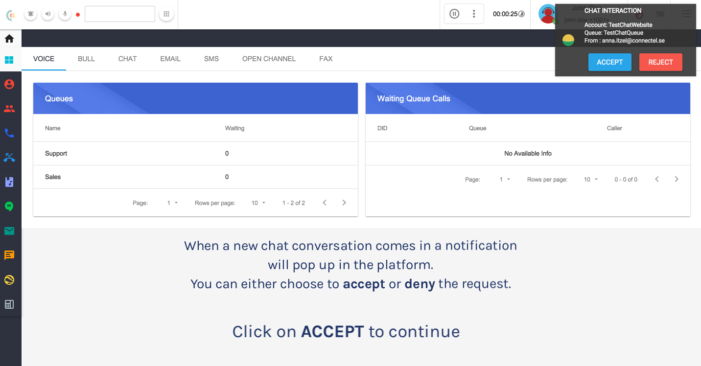 When a new chat conversation comes in a notification will pop up in the platform.You can either choose to accept or deny the request.