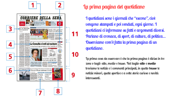 La prima cosa da osservare è che la prima pagina è divisa in tre zone o tagli: alto, medio e basso. Nel taglio alto e medio troviamo le notizie e i commenti principali, in quello basso le notizie minori, quelle sportive e a volte storie curiose e novità interessanti.