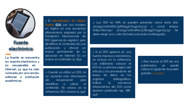 > Los DOI en APA se pueden presentar como texto (doi: 10.1093/oxfordhb/9780199772391.013.13) o como enlace (http://doi.org/ 10.1093/oxfordhb/9780199772391.013.13). Se debe elegir uno u otro formato para toda la bibliografía,.