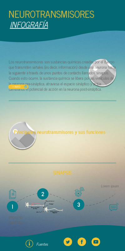 Los neurotransmisores son sustancias químicas creadas por el cuerpo que transmiten señales (es decir, información) desde una neurona hasta la siguiente a través de unos puntos de contacto llamados sinapsis. Cuando esto ocurre, la sustancia química se libera por las vesículas de la neurona pre-sináptica, atraviesa el espacio sináptico y actúa cambiando el potencial de acción en la neurona post-sináptica.