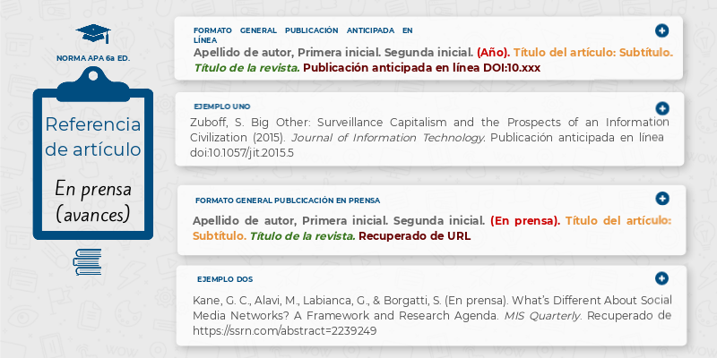 Apellido de autor, Primera inicial. Segunda inicial. (Año). Título del artículo: Subtítulo. Título de la revista. Publicación anticipada en línea DOI:10.xxx