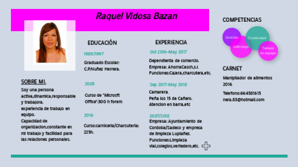 Soy una persona activa,dinamica,responsable y trabajora.experiencia de trabajo en equipo. Capacidad de organizacion,constante en mi trabajo y facilidad para las relaciones personales.