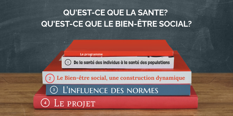 1 – Qu’est-ce que la santé ? Qu’est-ce que le bien-être social ? Qu'est-ce que la cohésion sociale ? Cours 1 De la santé des individus à la santé de la population :- La santé : un enjeu individuel, collectif et sociétal Cours 2 Bien-être social : une construction dynamique :- Processus de socialisation et insertion sociale Cours 3 - L'influence des normes