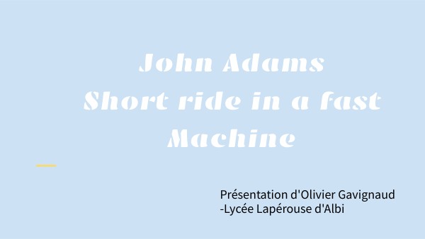- Dans Short ride in a fast machine, le style post-minimaliste d’Adams associe un grand raffinement orchestral issu de la tradition symphonique occidentale à des procédés compositionnels typiques de la musique répétitive (ostinati, boucles, variations…).- Adams est parvenu a donner un nouveau souffle à la musique minimaliste américaine en lui donnant une nouvelle dimension symphonique et dramatique personnelle.