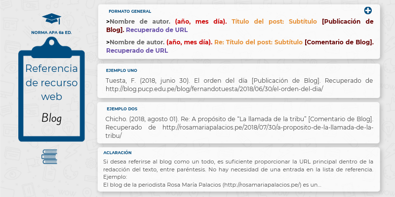 Si desea referirse al blog como un todo, es suficiente proporcionar la URL principal dentro de la redacción del texto, entre paréntesis. No hay necesidad de una entrada en la lista de referencia. Ejemplo: El blog de la periodista Rosa María Palacios (http://rosamariapalacios.pe/) es un...