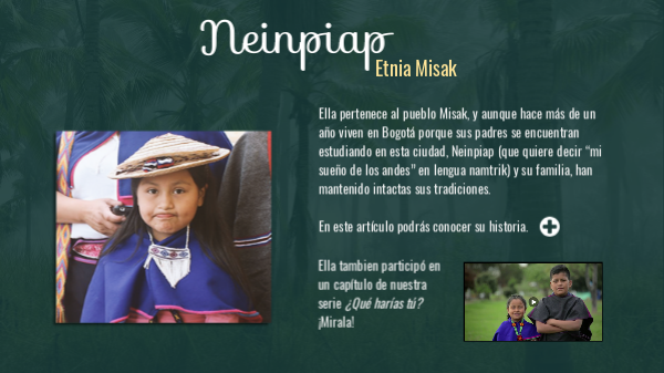 Ella pertenece al pueblo Misak, y aunque hace más de un año viven en Bogotá porque sus padres se encuentran estudiando en esta ciudad, Neinpiap (que quiere decir “mi sueño de los andes” en lengua namtrik) y su familia, han mantenido intactas sus tradiciones. En este artículo podrás conocer su historia.