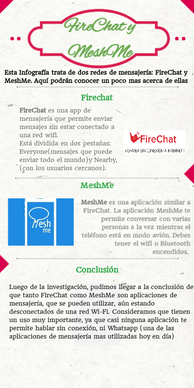Esta Infografía trata de dos redes de mensajería: FireChat y MeshMe. Aquí podrán conocer un poco mas acerca de ellas