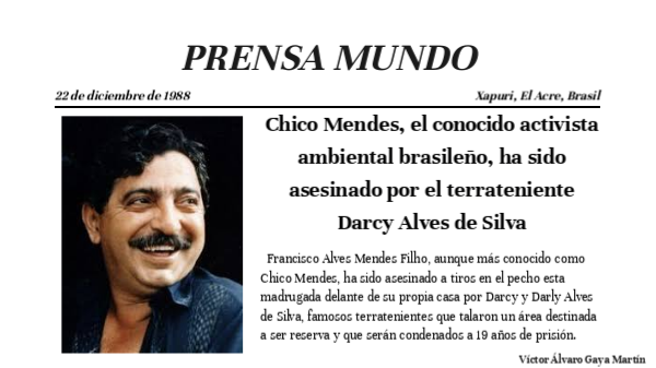 Chico Mendes, el conocido activista ambiental brasileño, ha sidoasesinado por el terrateniente Darcy Alves de Silva