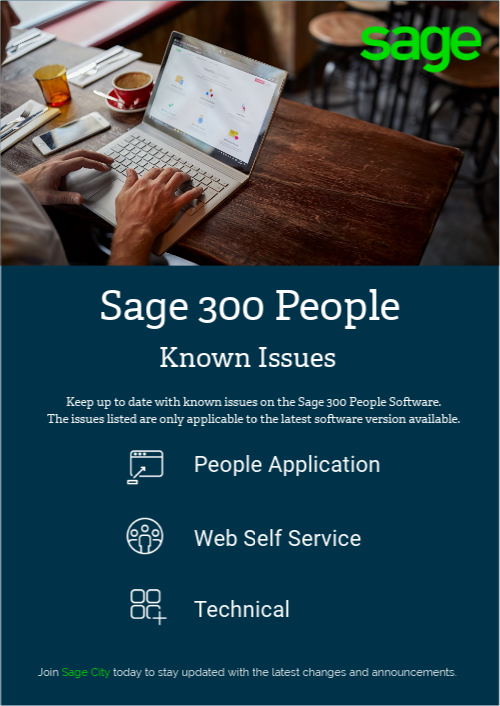 Keep up to date with known issues on the Sage 300 People Software.The issues listed are only applicable to the latest software version available.