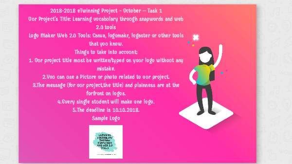 2018-2018 eTwinning Project - October – Task 1 Our Project’s Title: Learning vocabulary through snapwords and web 2.0 tools Logo Maker Web 2.0 Tools: Canva, logomakr, logaster or other tools that you know. Things to take into account; 1. Our project title must be written/typed on your logo without any mistake. 2.You can use a Picture or photo related to our project. 3.The message (for our project,the title) and plainness are at the forfront on logos. 4.Every single student will make one logo. 5.The deadline is 10.10.2018. Sample Logo