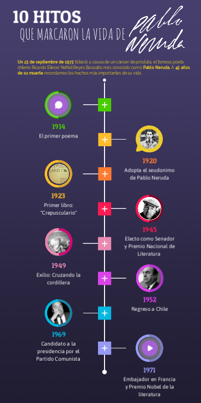Un 23 de septiembre de 1973 falleció a causa de un cáncer de próstata, el famoso poeta chileno Ricardo Eliécer Neftalí Reyes Basoalto más conocido como Pablo Neruda. A 45 años de su muerte recordamos los hechos màs importantes de su vida.
