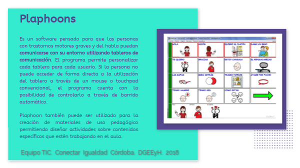 Es un software pensado para que las personas con trastornos motores graves y del habla puedan comunicarse con su entorno utilizando tableros de comunicación. El programa permite personalizar cada tablero para cada usuario. Si la persona no puede acceder de forma directa a la utilización del tablero a través de un mouse o touchpad convencional, el programa cuenta con la posibilidad de controlarlo a través de barrido automático. Plaphoon también puede ser utilizado para la creación de materiales de uso pedagógico permitiendo diseñar actividades sobre contenidos específicos que estén trabajando en el aula.