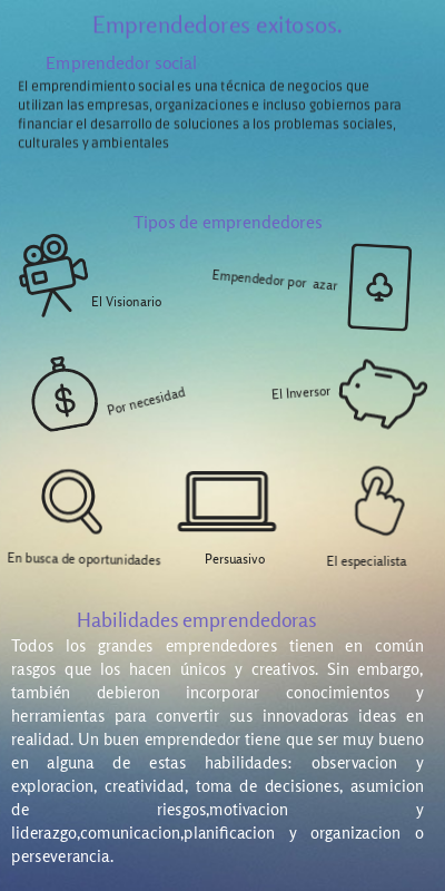 Todos los grandes emprendedores tienen en común rasgos que los hacen únicos y creativos. Sin embargo, también debieron incorporar conocimientos y herramientas para convertir sus innovadoras ideas en realidad. Un buen emprendedor tiene que ser muy bueno en alguna de estas habilidades: observacion y exploracion, creatividad, toma de decisiones, asumicion de riesgos,motivacion y liderazgo,comunicacion,planificacion y organizacion o perseverancia.