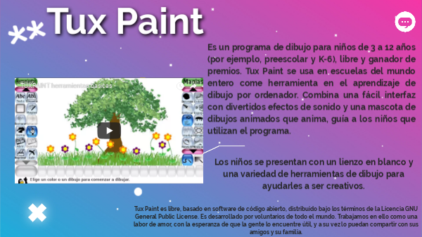 Es un programa de dibujo para niños de 3 a 12 años (por ejemplo, preescolar y K-6), libre y ganador de premios. Tux Paint se usa en escuelas del mundo entero come herramienta en el aprendizaje de dibujo por ordenador. Combina una fácil interfaz con divertidos efectos de sonido y una mascota de dibujos animados que anima, guía a los niños que utilizan el programa.