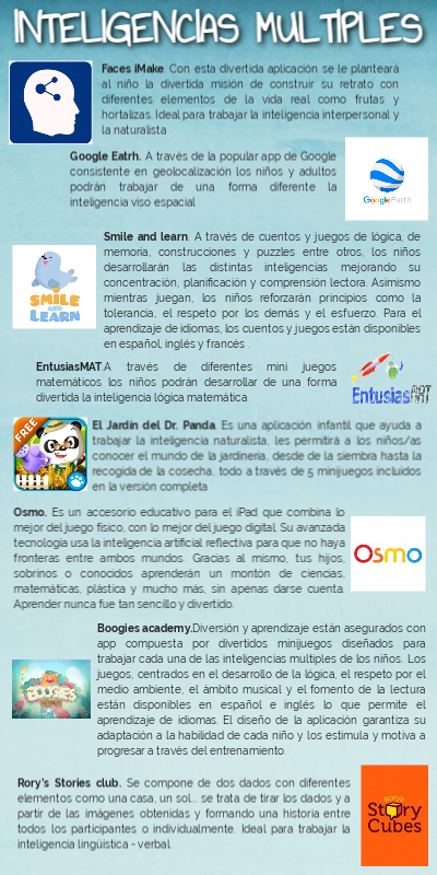 Boogies academy.Diversión y aprendizaje están asegurados con app compuesta por divertidos minijuegos diseñados para trabajar cada una de las inteligencias multiples de los niños. Los juegos, centrados en el desarrollo de la lógica, el respeto por el medio ambiente, el ámbito musical y el fomento de la lectura están disponibles en español e inglés lo que permite el aprendizaje de idiomas. El diseño de la aplicación garantiza su adaptación a la habilidad de cada niño y los estimula y motiva a progresar a través del entrenamiento.