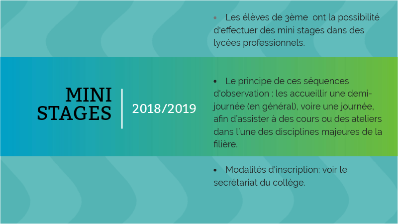 - Les élèves de 3ème ont la possibilité d'effectuer des mini stages dans des lycées professionnels.
