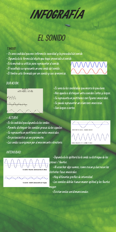 TIMBRE: - Es una cualidad que nos informa la suavidad y la gravedad del sonido.- Depende de la forma del objeto que haya provocado el sonido. -Este metodo se utiliza para representar el sonido. -El resultado se representa en una onda del sonido. -El timbre esta formado por un sonido y sus armónicas. DURACIÓN: -Es una de las cualidades que marca lo que dura. -Nos ayuda a distinguir entre sonidos cortos y largos. -Se representa en partituras con figuras musicales. -Se puede representar en silencions musicales. -Son largos o cortos. - ALTURA: -Es la cualidad que depende de las ondas. -Permite distinguir los sonidos graves de los agudos. -Se representa en partituras con notas musicales. -En psicoacústica es un parámetro. -Las ondas se originan por el movimiento vibratorio. INTENSIDAD: -Depende de la apliturd de la onda se distingue de los graves / fuertes. -Al escuchar algo vemos, como crecen y descrecen las distintas fases musicales. -Hay diferentes grafías de intensidad. -Los sonidos débiles tienen menor aplitud y los fuertes mayor. -Existen ondas unidimensionales.