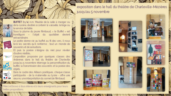 BUFFET [by.fɛ] n.m. Meuble de la salle à manger ou de la cuisine, destiné à contenir la vaisselle, le linge ou le service de table. Sous la plume du jeune Rimbaud, « le Buffet » est transfiguré – l’objet du quotidien devient extraordinaire. Le poète donne vie au buffet au fil des vers, il nous livre les secrets qu’il renferme ; tout un monde de souvenirs et de sensations. Et puis la poésie s’éloigne du réel pour révéler d’autres réalités… L’exposition proposée par quelques classes des Ardennes dans le hall du théâtre de Charleville jusqu'au 5 novembre interroge la personnification du buffet, la transmission des souvenirs et la poésie des objets. Dans le cadre des Ailleurs poétiques, chaque classe participante - de la maternelle au lycée - offre une œuvre, une interprétation du sonnet de Rimbaud.