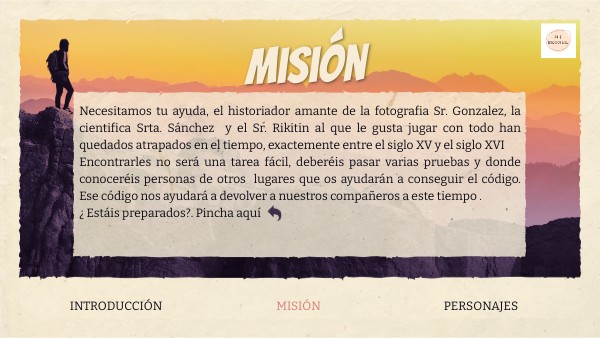 Necesitamos tu ayuda, el historiador amante de la fotografia Sr. Gonzalez, la cientifica Srta. Sánchez y el Sr. Rikitin al que le gusta jugar con todo han quedados atrapados en el tiempo, exactemente entre el siglo XV y el siglo XVIEncontrarles no será una tarea fácil, deberéis pasar varias pruebas y donde conoceréis personas de otros lugares que os ayudarán a conseguir el código. Ese código nos ayudará a devolver a nuestros compañeros a este tiempo . ¿ Estáis preparados?. Pincha aquí