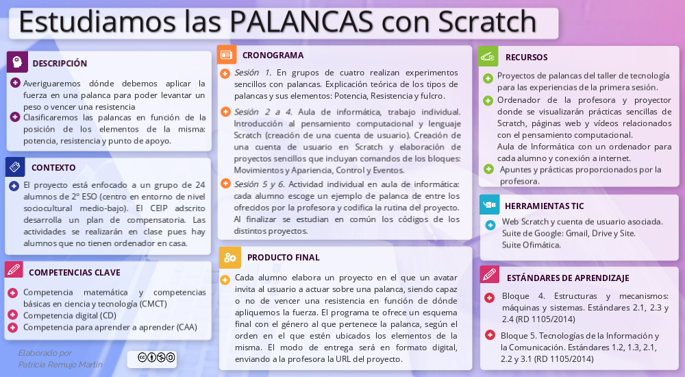 Sesión 5 y 6. Actividad individual en aula de informática: cada alumno escoge un ejemplo de palanca de entre los ofrecidos por la profesora y codifica la rutina del proyecto. Al finalizar se estudian en común los códigos de los distintos proyectos.